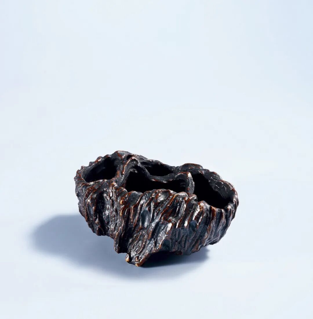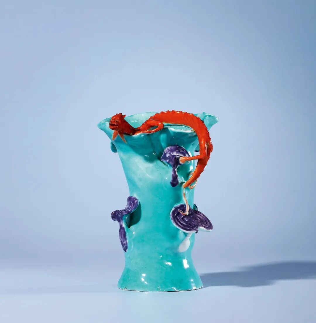 清代 松石绿釉紫彩盘螭龙灵芝形花插