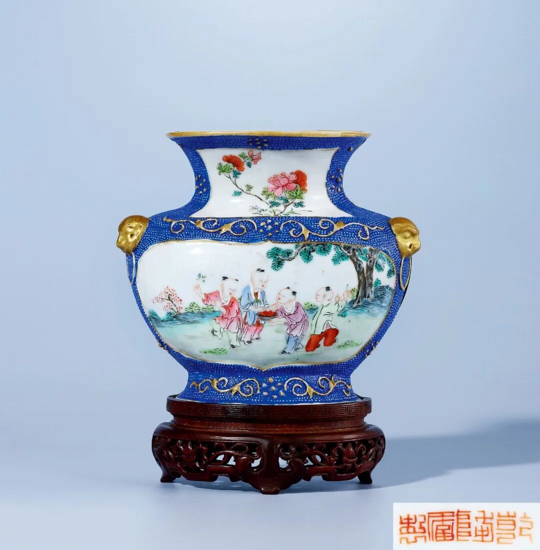 清乾隆 粉彩珍珠地开光婴戏图壁瓶