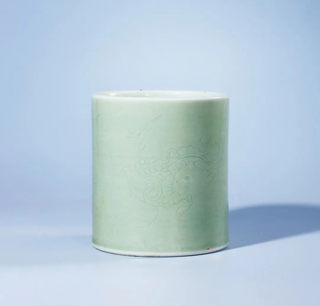 清康熙 青釉暗刻夔龙灵芝纹笔筒