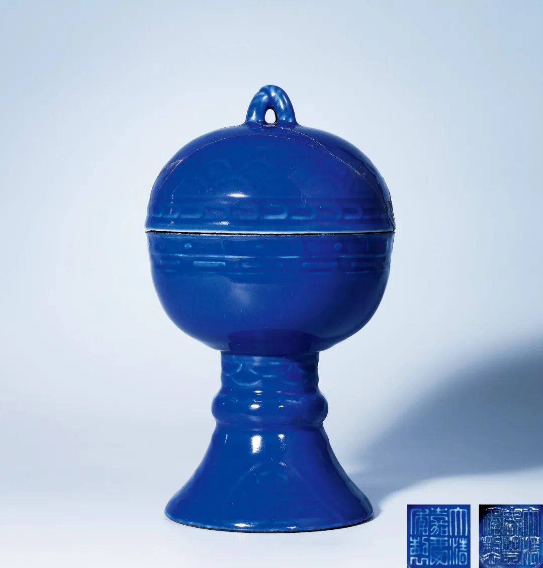 清咸丰 霁蓝釉仿青铜窃曲纹豆(盖为嘉庆)