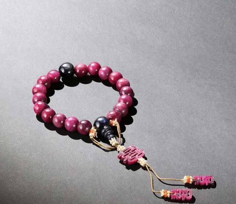 瑰丽、华贵的红宝石是宝石之王,是宝中之宝,其优点超过所有的宝石。有的古书中认为红宝石是“上帝创造万物时所创造的十二种宝石中最珍贵的”。此手串上之红宝石颜色鲜红、美艳,可以称得上是“红色宝石之冠”。整器胎质细腻,色泽纯美,质地盈润,温和通透,圆浑敦实,洁净纯正,曲线婉转,观之喜庆,极具高雅富贵之气,富有很高的收藏价值。