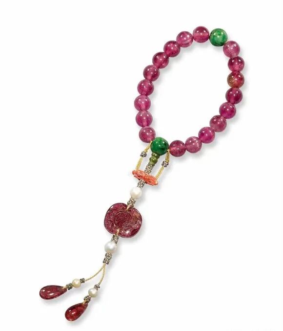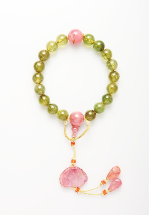 此款手串以十八颗翡翠制作而成,翠质晶莹透彻,色泽华美,之间以四颗粉红碧玺隔成四段,粉红色碧玺佛头佛塔,娇艳耀目。另有米粒珍珠,聚列成结。下方以浅色绦带系金刚杵,下系一精致小巧的粉红碧玺锁形佩,锁上刻有“长命富贵”四字,又以粉红碧玺为两坠角,工艺细致,琢制精心。是款手串不仅翠材极为珍贵,设计也颇为精奇,金属之光,翠石之泽,相映成趣,是为点睛之笔,蕙质匠心,令人拍案叫绝。