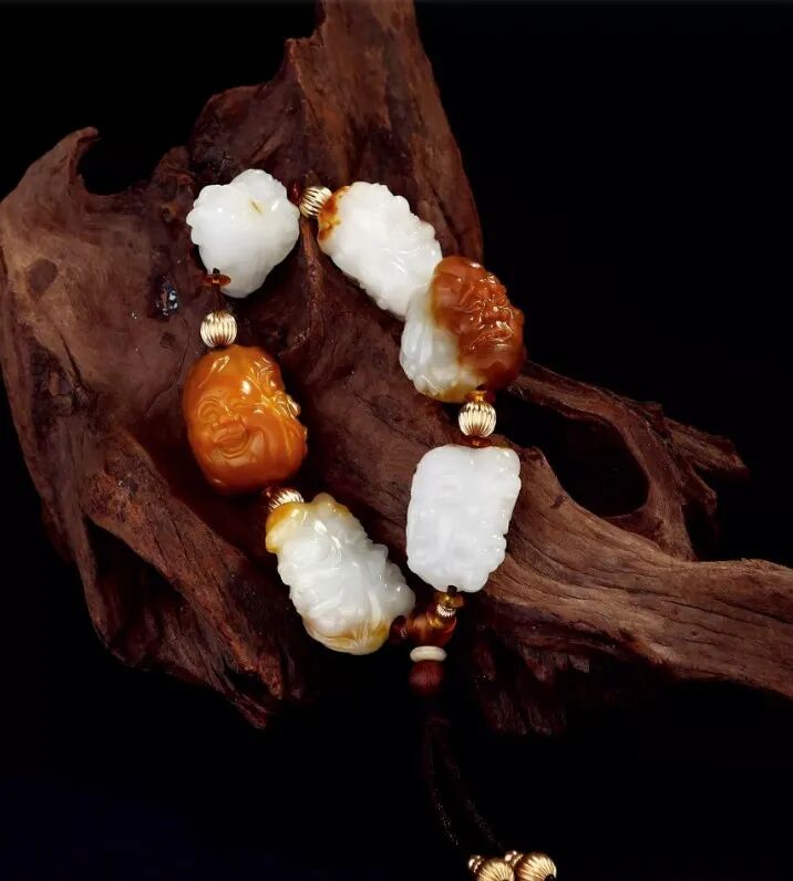 此手串由六颗和田白玉原籽组成,玉质温润细泽,糖色浓郁,颗颗饱满圆润。每颗采用立体圆雕的手法,随形雕刻三面罗汉,共计十八位,他们或嬉笑,或严肃,或诙谐,或静或动……形态各异,生动传神,罗汉形象跃然于眼前,于细微处见雕者之功力。六颗则代表耳、鼻、舌、眼、身、意这六根六情;而十八罗汉者则代表皆身心六根清净,安然超脱,寓意勇敢、坚毅,值得赏玩。