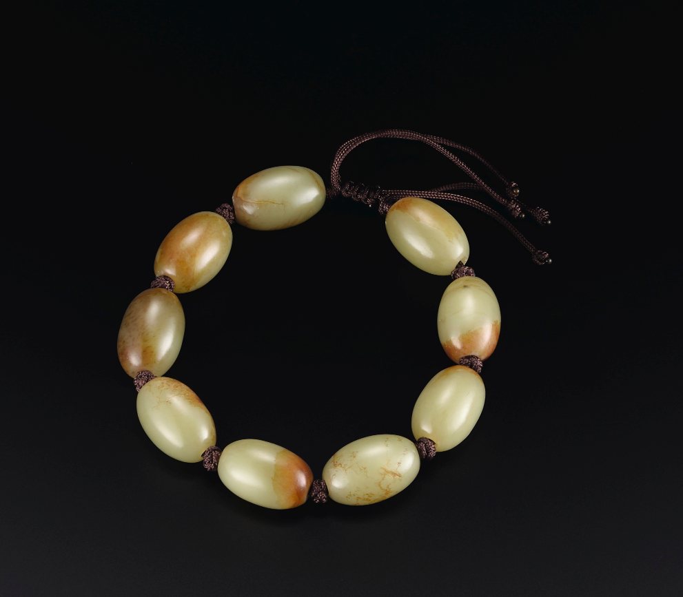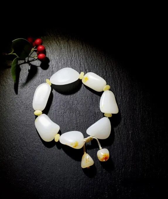 作品精选九颗籽料原石串联而成,色若羊脂,皮色淡雅,玉质细腻,以蜜蜡相隔,搭配养眼,低调奢华,值得拥有。