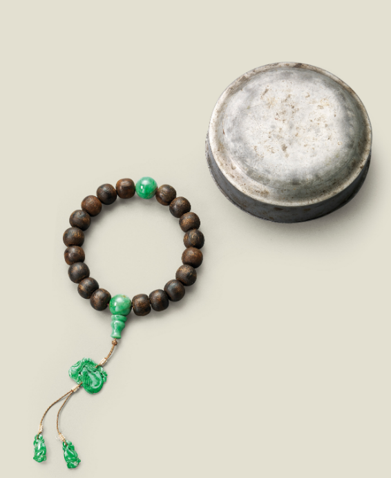 系用伽南香打磨成珠,通体雕刻一“寿”字,后镶以金粟,其工作量比普通伽南串珠多数倍。迦南香之古朴与金粟之辉煌交相辉映,华美而不失质朴。此手串应为皇室成员祝寿时所赠礼物,雕琢一丝不苟,独具匠心,其精美的材料和高超的工艺体现着主人的身份与地位。