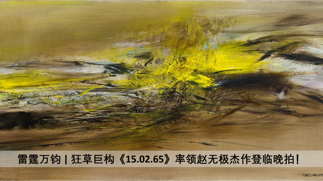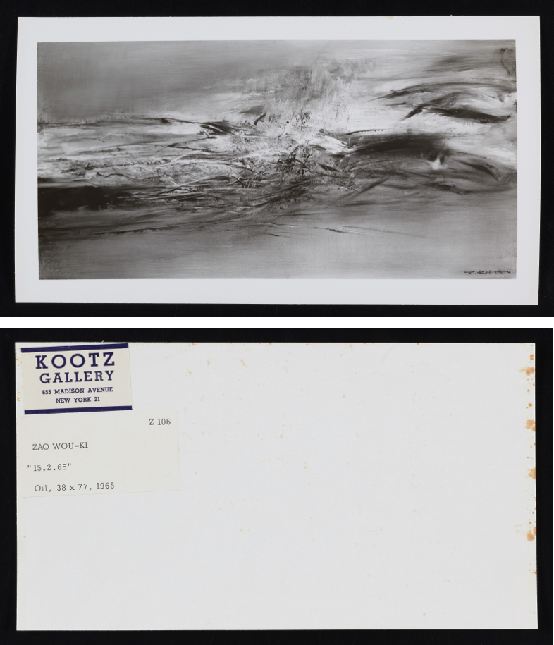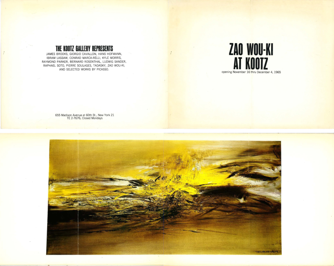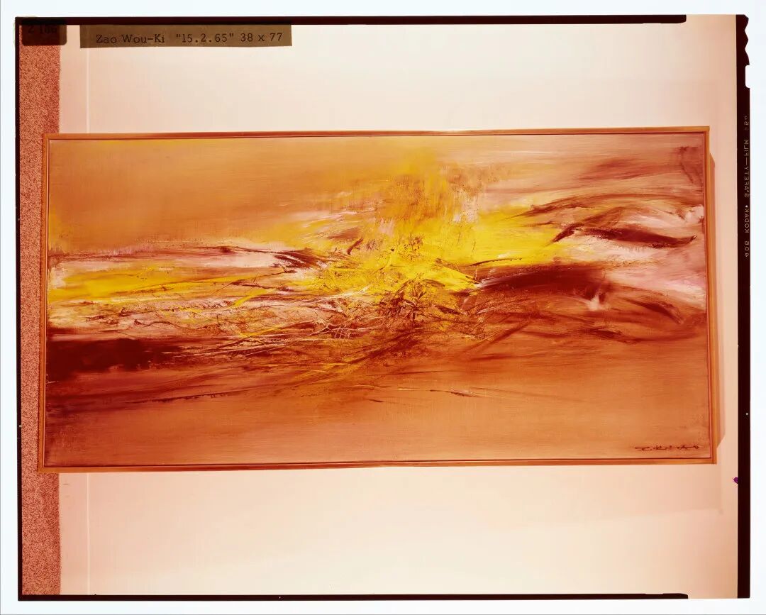 赵无极与毕加索早于五〇年代相识于巴黎,成为忘年之交,而《15.02.65》与《冠冕女子与国王饼》更同时于一九六五年初诞生。两幅作品风格迥异,却分别是赵无极和毕加索当时的顶尖杰作,可见当时巴黎画坛百花齐放的盛况。《15.02.65》正是赵无极「狂草时期」的巅峰之作:迅疾澎湃的狂草线条从左右两侧闯入画面,在中央交集冲突,而明黄色调则如金光一般燃亮画面,绘制出一幅气势磅礴如万马奔腾的作品。近赏《15.02.65》,彷佛能透过狂野的笔触,看见年富力强的赵无极站在这巨幅画布前,提起画笔,潇洒淋漓地进行一次创作上的搏斗。本作创作于赵无极与纽约库兹画廊的合作期间,凝聚了赵无极狂草作品的经典元素。本作曾在一九六五年赵无极库兹画廊个展中以最重要作品展出,而罕有印刷图录的库兹画廊也为了这次展览特别用本作制作了宣传单张;在美国史密森尼学会收藏的库兹画廊档案,更可发现多张库兹画廊拍摄《15.02.65》以作记录的照片,弥足珍贵。