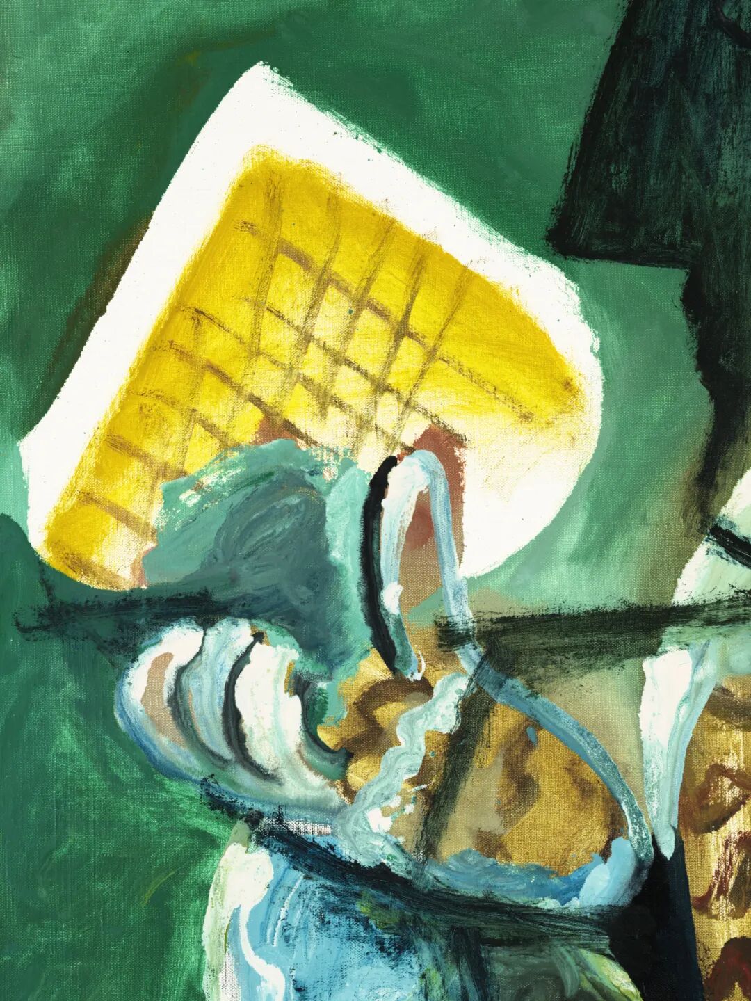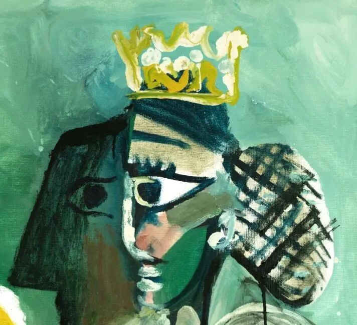 毕加索精彩的创作生涯,以其缪斯女神的肖像作品最为经典。本作描绘艺术家第二任妻子贾桂琳萝可(Jacqueline Roque);贾桂琳成就了艺术家毕生最庞大、最长久的主题系列,入画频率大幅超越过往的女伴。在《冠冕女子与国王饼》中,毕加索利用立体派技法勾勒贾桂琳的轮廓:浓密的眼眉、亮丽的眼睛,以及其最标志性的长直鼻子,并营造出曼妙的雕塑感;其脸部分割为多个层次,阴影为侧脸、明艳亮丽的部分则为正面,增添视觉趣味;画作构图包罗粉红、祖母绿、天蓝、鹅黄等瑰丽色泽,几乎未见空白位置,使作品更显细腻缤纷。