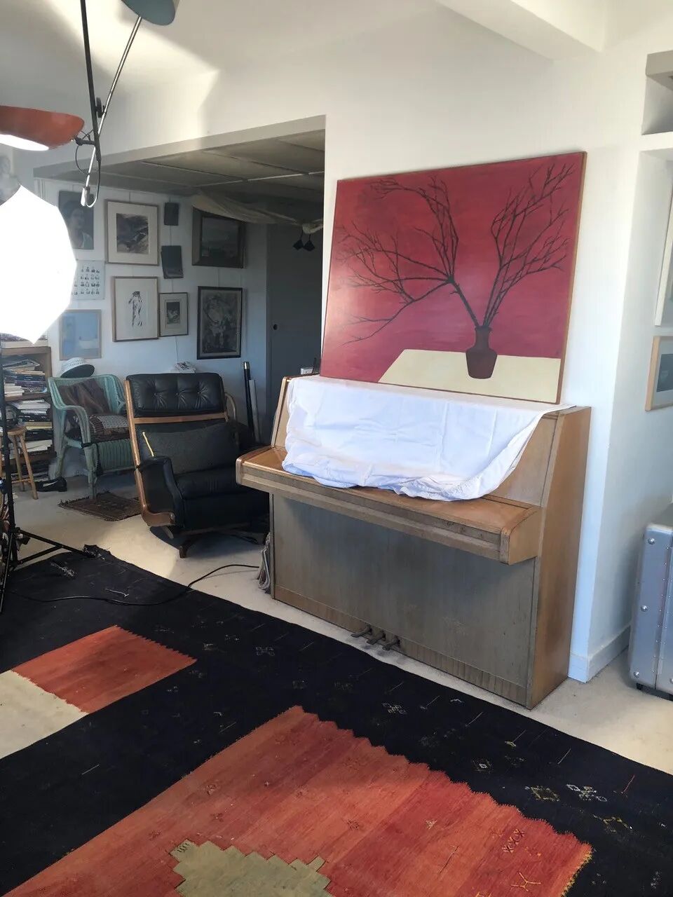 常玉油画全集总编辑衣淑凡女士与常玉《红底瓶枝》原藏家伊夫·哈皮利于画作前对话。Courtesy of the Andrea Frank Foundation