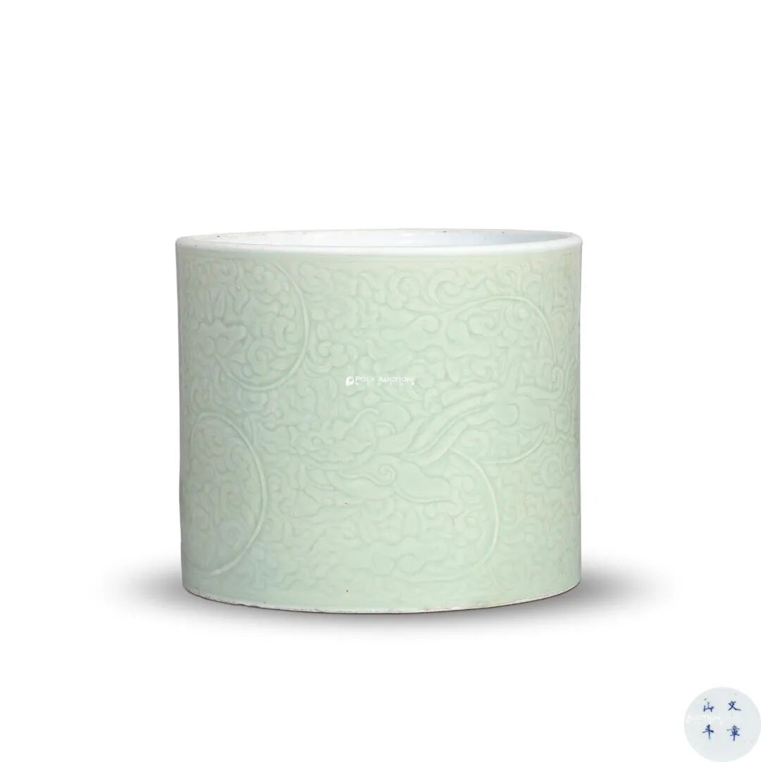清康熙 冬青釉暗刻螭龙穿缠枝灵芝纹笔筒