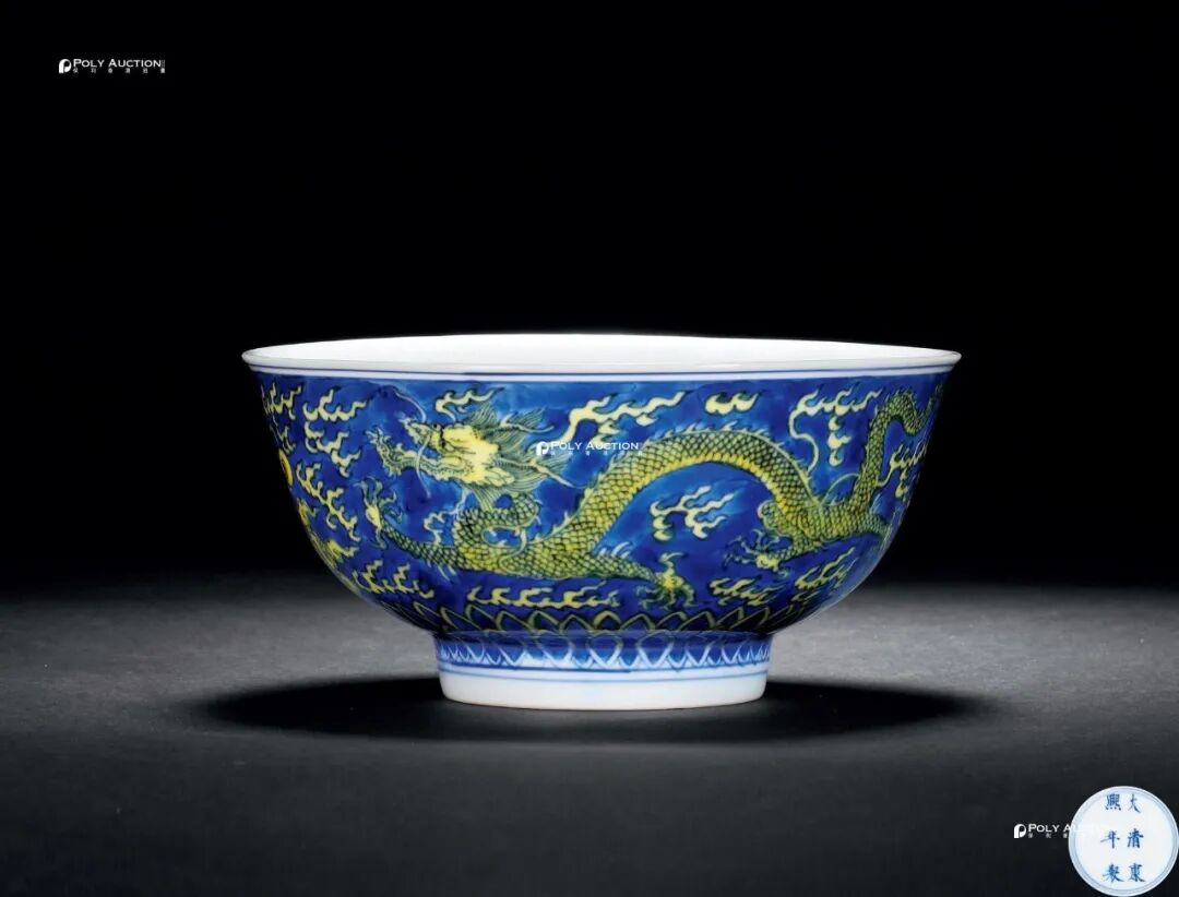 清康熙 蓝地黄彩龙纹碗