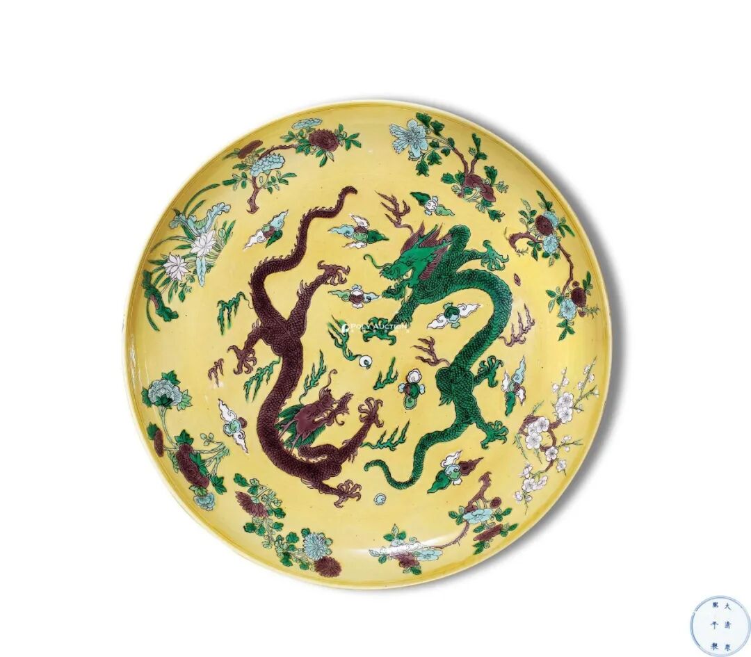 清康熙 黄地素三彩折枝花卉龙纹大盘