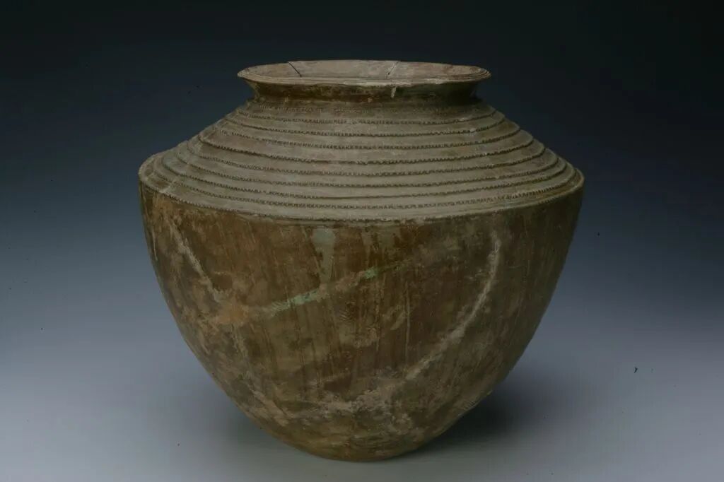 原始瓷青釉弦纹罐,商,高31.4厘米,口径20厘米,底径9.3厘米。