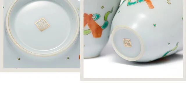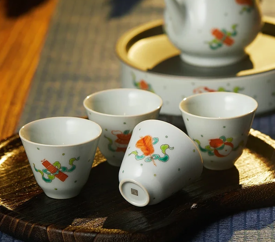 每只杯子两侧各绘有两种不同的法器,四只杯子合为暗八仙。