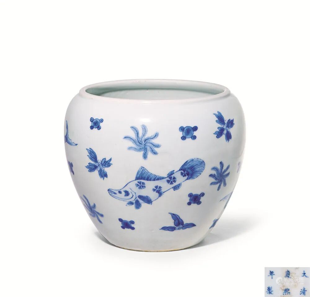 而能烧制此种尺寸之大龙缸,非龙缸窑莫属。据明隆庆陈学干著《陶政录》、清嘉庆蓝浦著《景德镇陶录》等文献载,明清御器厂内的窑分六种:烧制高温白瓷的风火窑、烧颜色釉瓷的色窑、仿烧青瓷的青窑、烧龙缸的龙缸窑、烧制彩瓷的大小槛璜窑、烧窑具的匣窑。龙缸烧造难度极高,直至康熙时期御窑厂重建,龙缸才得复烧成功。本品即为康熙朝御窑重建后制出作品。