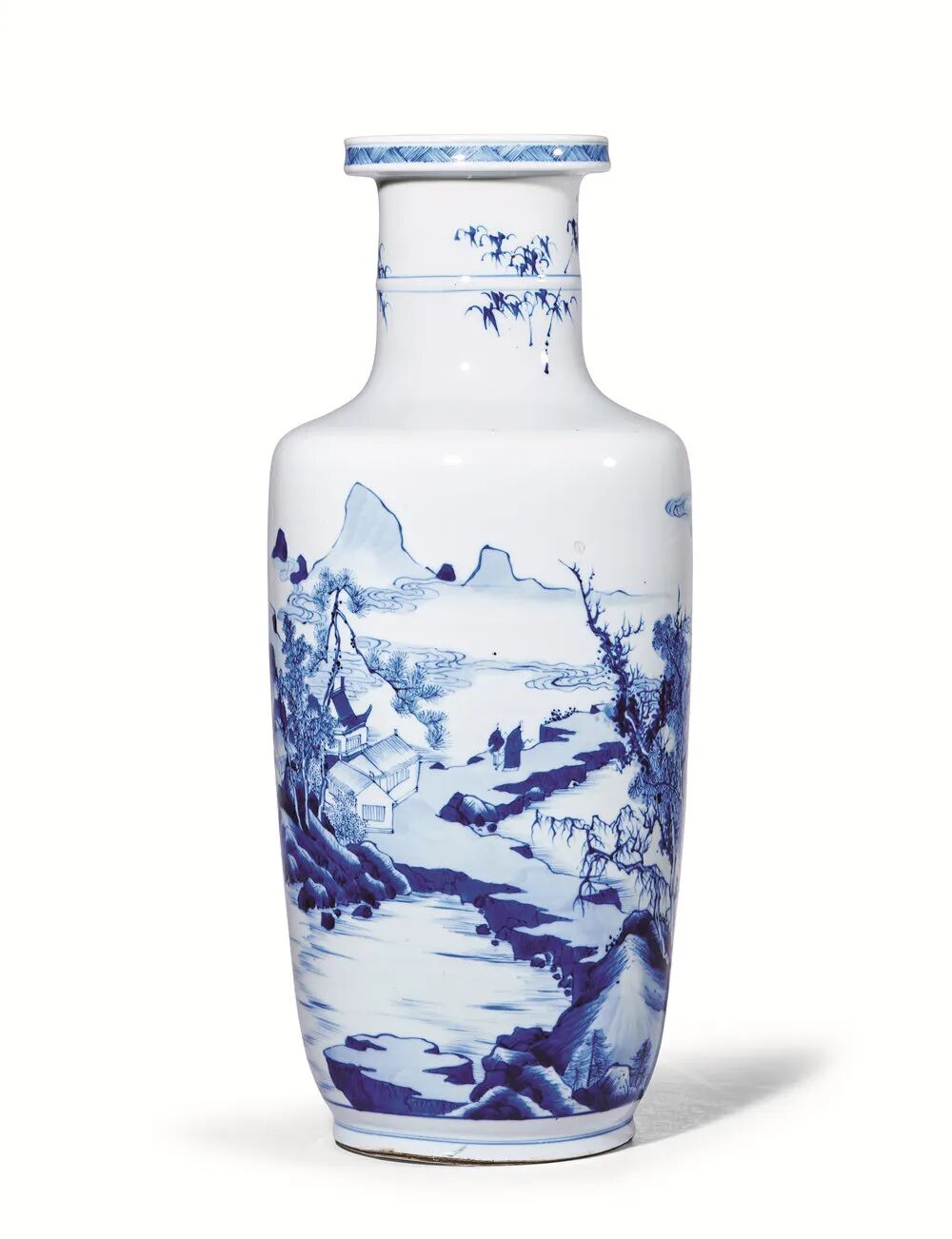拍品估价:150,000 - 250,000 人民币棒槌瓶为康熙时期创新器型,其瓶腹平缓甚适展示瓷画之美,故广为流行,所画题材丰富繁多,令人叹为观止。拍品器形稳重,撇口折沿,直颈,平肩,直腹微下敛,圈足,胎白质坚。外壁以青花绘山水楼阁图,画中山石层层皴染,古木参天,庐舍、草亭数间隐于其中,山石铿锵有力,青花浓淡有致。画面意境高远,画中人物策杖远行,再配以山石嶙峋,古树遒劲,溪流潺潺,流云迤逦,一派寄情于山水之高隐风范。全器青花发色青翠纯正,层次分明,实为难得康熙之陈设佳器。