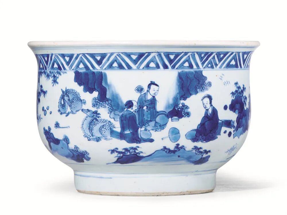 本品口微侈,垂腹,及底内收,下承圈足,胎体细腻洁白,胎质紧实。通体饰白釉,釉面肥厚润泽。外壁以青花为饰,腹部通景绘高士清谈图。山石矗立,草木幽然,三名高士席地而坐,清谈国事,不远处一梅花鹿盘卧在地,整体构图简洁明快,纹饰描绘精细雅致。