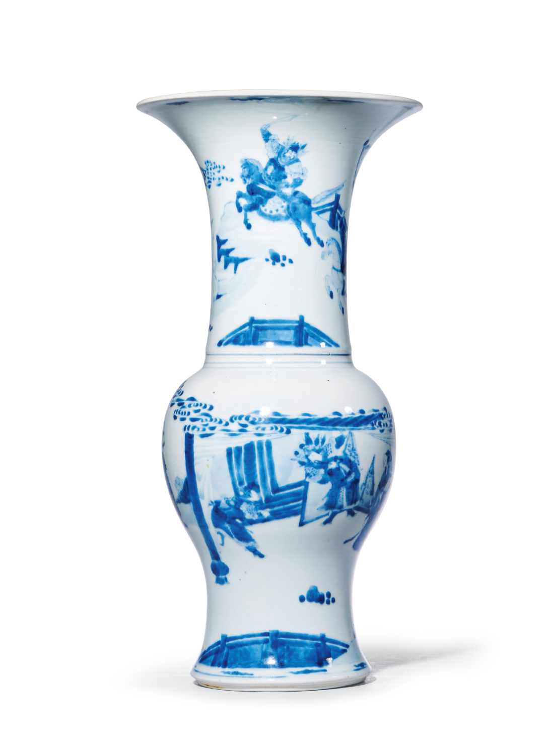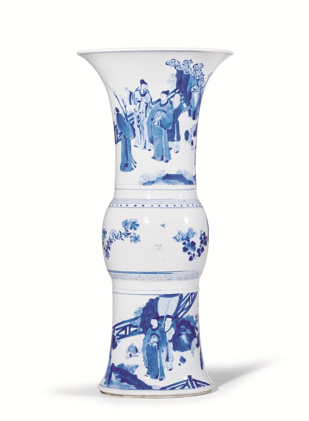 本品作喇叭形口,腹部微鼓,胫部外撇,足脊露坚实洁白的胎体,通体施白釉,釉色清透平整,釉质肥厚,有紧皮亮釉之感,外壁以青花描绘自上而下三层纹样,为康熙一朝的经典纹样布局,以钴蓝料单线勾勒外形,颈部饰以指日高升图,一儒者着官服,宽衣肥袖,神情满满,与另一长者指日而语,整幅画面层次丰富,饱满自然,寓蟾宫折桂,指日高升之美意;腹部饰折枝荷花、芍药、菊花三组;胫部画面中央一人身着官服,神采奕奕,望向身前手捧爵杯的小童,寓“加官进爵”之意,周围侍者各具其态,画面丰富,颇具表现力。以寥寥数笔描绘出细微的人物神态,峻伟的自然景观,可鉴精工。