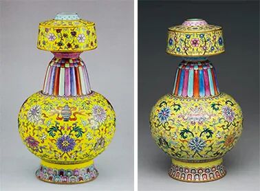 左图:清乾隆 黄地粉彩八吉祥纹贲巴瓶,上海博物馆藏右图:清乾隆 黄地粉彩八吉祥纹贲巴瓶,台北故宫博物院藏此外暂得楼胡惠春先生旧藏、五台山人递藏的一只清道光御制黄地洋彩莲托八吉祥纹贲巴瓶,此件藏品在器型与纹饰上与本件拍品一脉相承,可见历代帝王对此类作品均十分珍爱,故延烧不绝。
