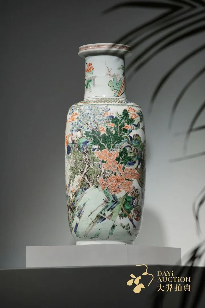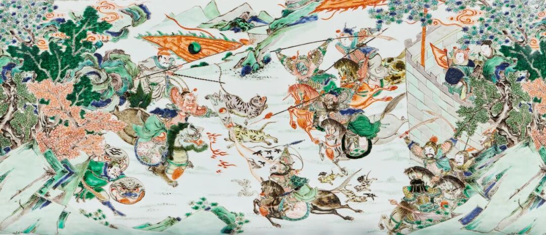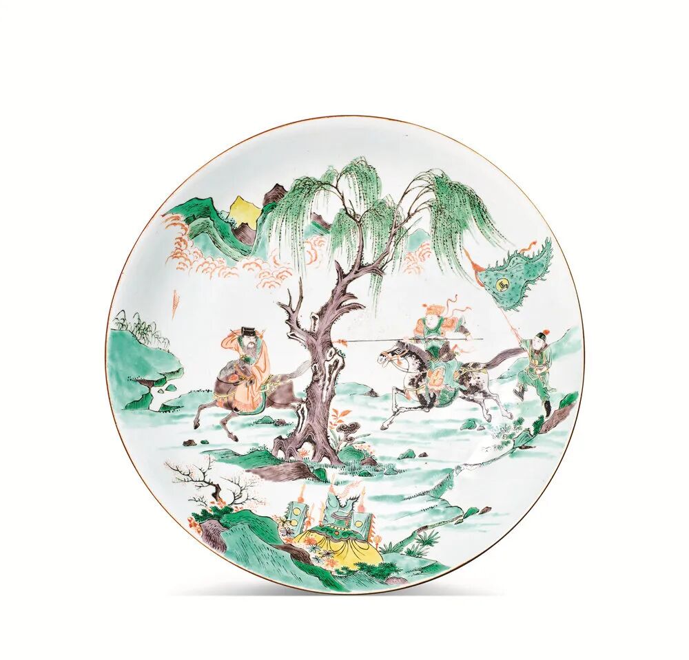 拍品估价:400,000 - 600,000 人民币1.美国克利夫兰艺术博物馆藏,清康熙 五彩人物纹棒槌瓶2.美国明尼阿波利斯博物馆藏,清康熙 五彩人物纹盘本品腹部五彩通景绘《东汉秘史》第二十九回「创业兴王遍事贤 明贤一举妖人破」之「马援挝打聚兽牌」故事:战场中心骑兽者为王莽麾下大将巨无霸,其手中持盾名曰“聚兽牌”,敲动聚兽牌即可驱使虎豹犀象助阵。画面下方骑马战斗者为刘秀一方大将曰马援,其身后正飞出硬铁飞锸。整幅画面阵容宏大,故事突出,人物描绘细腻,釉彩保存堪称完美,不失为熙朝五彩无上佳品。