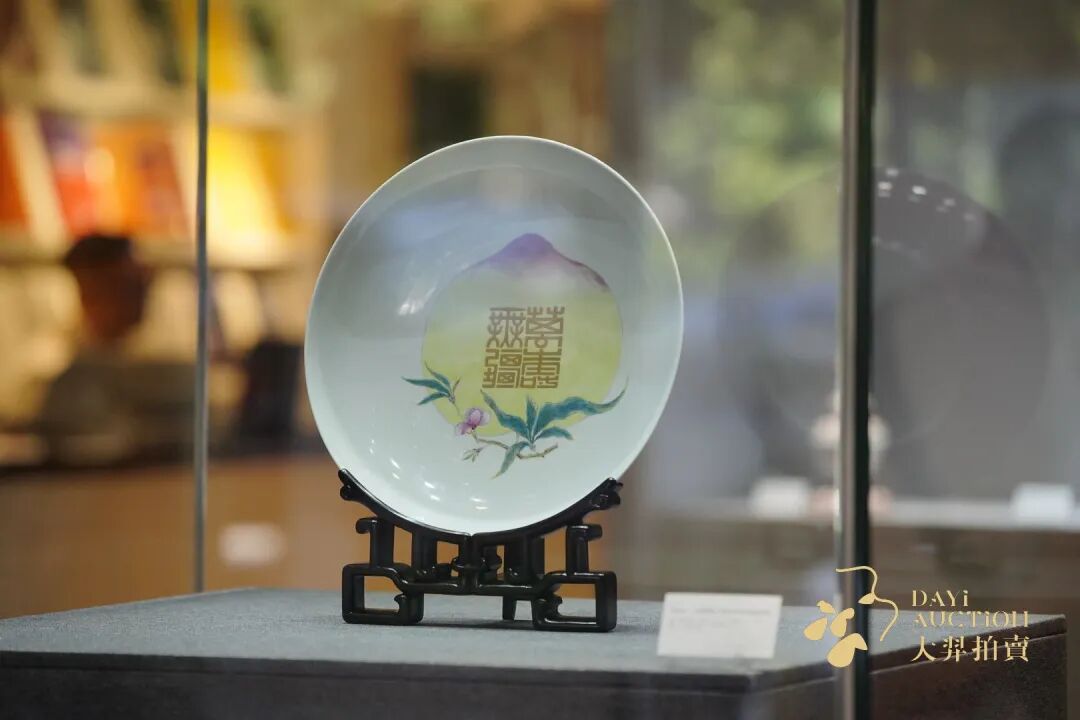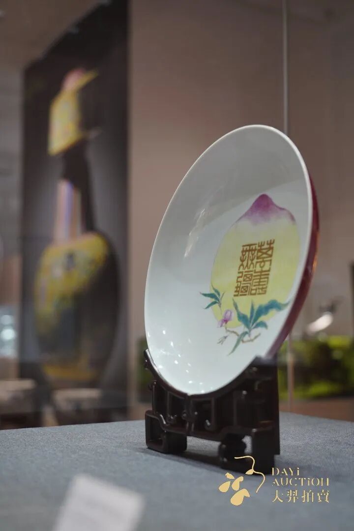 拍品估价:1,200,000 - 1,800,000 人民币记录:伦敦佳士得,1980年7月14日,编号242著录:《佳士得图说中国陶瓷史》,Anthony du Boulay,1984年,页236此胭脂红釉内粉彩「万寿无疆」桃纹盘属于「祥瑞」纹饰类御用瓷器,其寓意以硕大饱满的寿桃形象为雍正帝万寿节祝贺,恭祝雍正帝万寿无疆。纹饰描绘入微,饱满莹润,枝叶繁茂,经脉毕现。盘之纹样画工新颖别致、细腻典雅,施彩技术亦妙至毫巅。桃花用细线勾勒轮廓,粉彩层次分明。寿桃绘工精妙入神,笔触细腻,用色丰富,色调淡雅,以胭脂红点染出桃尖,以致外表由淡黄至粉红,从而使果实甘熟欲滴的质感彰显无遗。寿桃相传为西王母所赐,集三千年日月精华才花开结果,食者延年益寿,故寿桃代表长寿之美好寓意。寿桃中以金彩书「万寿无疆」四字篆书祝词,与寿桃相映成辉,共祝圣上寿与天齐之意。记录:伦敦佳士得,1980年7月14日,编号242本件拍品的传承可见伦敦佳士得1980年6月14日,本件拍品在这次拍卖中编号为242,八十年代的佳士得拍卖图录一般为黑白印刷,只有极少数精品珍罕之作才会采用彩图印刷,本件拍品在佳士得这一专场中即为少数几只彩图印刷的拍品,可见当时即对这一拍品十分重视。除此之外,《佳士得图说中国陶瓷史》中亦有本件拍品的记载,可证这一作品之可靠传承。与本件拍品在形制与纹饰上均极为近似的作品可见北京故宫博物院收藏的清康熙五彩加金「万寿」折枝寿桃纹盘,与本品均为盘心绘寿桃并金彩篆书,只是康熙作品为五彩加金彩篆书「万寿」二字,本拍品为粉彩加金彩篆书「万寿无疆」四字。虽然二者在用彩方面有所区别,但整体纹饰风格到盘型尺寸均可见艺术传承。且本件拍品尺寸与传统御窑盘类尺寸不同,传统御窑盘尺寸一般作二寸五碟、三寸碟、四寸碟、五寸盘、七寸盘、九寸盘,如本品之八寸盘则属稀见品种,更突显本品之珍罕。