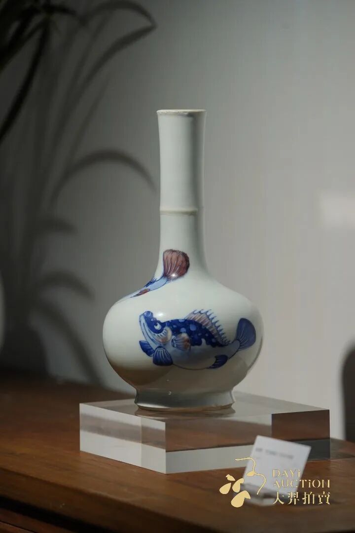 本品敛口,圆腹,圈足,造型饱满。器身以青花绘鱼化龙纹,鲤鱼身形丰盈,奋力跃出,龙纹飘逸,栩栩如生;纹饰清晰流畅,青花浓艳,极具时代特征。鱼化龙纹是明清瓷器中常见的吉祥图案之一。它取材于古代「鲤鱼跳龙门」的传说,传说凡能跳上龙门的大鱼,便可变化成龙,亦称“鱼化龙”。因古时科举考试场所所贡院的正门也称“龙门”,所以又指参加科举中第而声名显赫者。