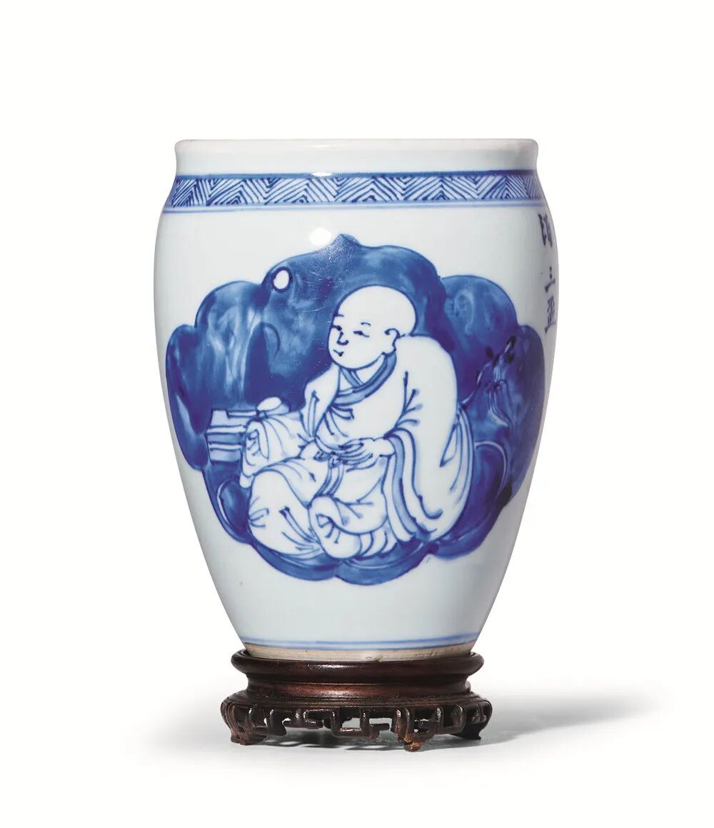 拍品估价:80,000 - 100,000 人民币记录:巴黎苏富比,2020年12月11日,编号185本品器形雅致,大小适中,相对同类器更为俊雅,颇适置于案头。器身外壁以青花绘罗汉图,人物形态生动,青花色阶丰富,另一面题诗曰:“柳上月中翠,柳随落尘环,相逢非偶觞,咏悮死生快,乐天宫重琴,身先开反寻,善唱奉供酒三杯”。全器诗画俱全,雅逸清幽,当为青花文房之佳作。