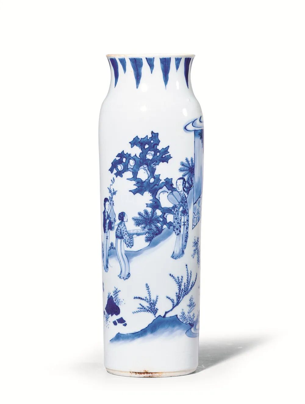 拍品估价:250,000 - 350,000 人民币此件筒瓶尺寸较小,造型端庄秀挺,胎骨厚重坚致,釉汁滋润明亮,时代特征鲜明。口沿饰蕉叶纹一周,腹部青花全景主饰庭院拜月图,通景取景,月色笼罩下,妇人庭院伫立,眉目温婉,优雅婀娜,其后侍女持瓶静候,又道赏花有佳色,裛露掇其英,不知乘月几人归,落月摇情满江树,最是怡情怡景。青花发色蓝中闪灰,绘笔涂勾挥洒自如,图饰线条自然飘逸,别有情趣。
