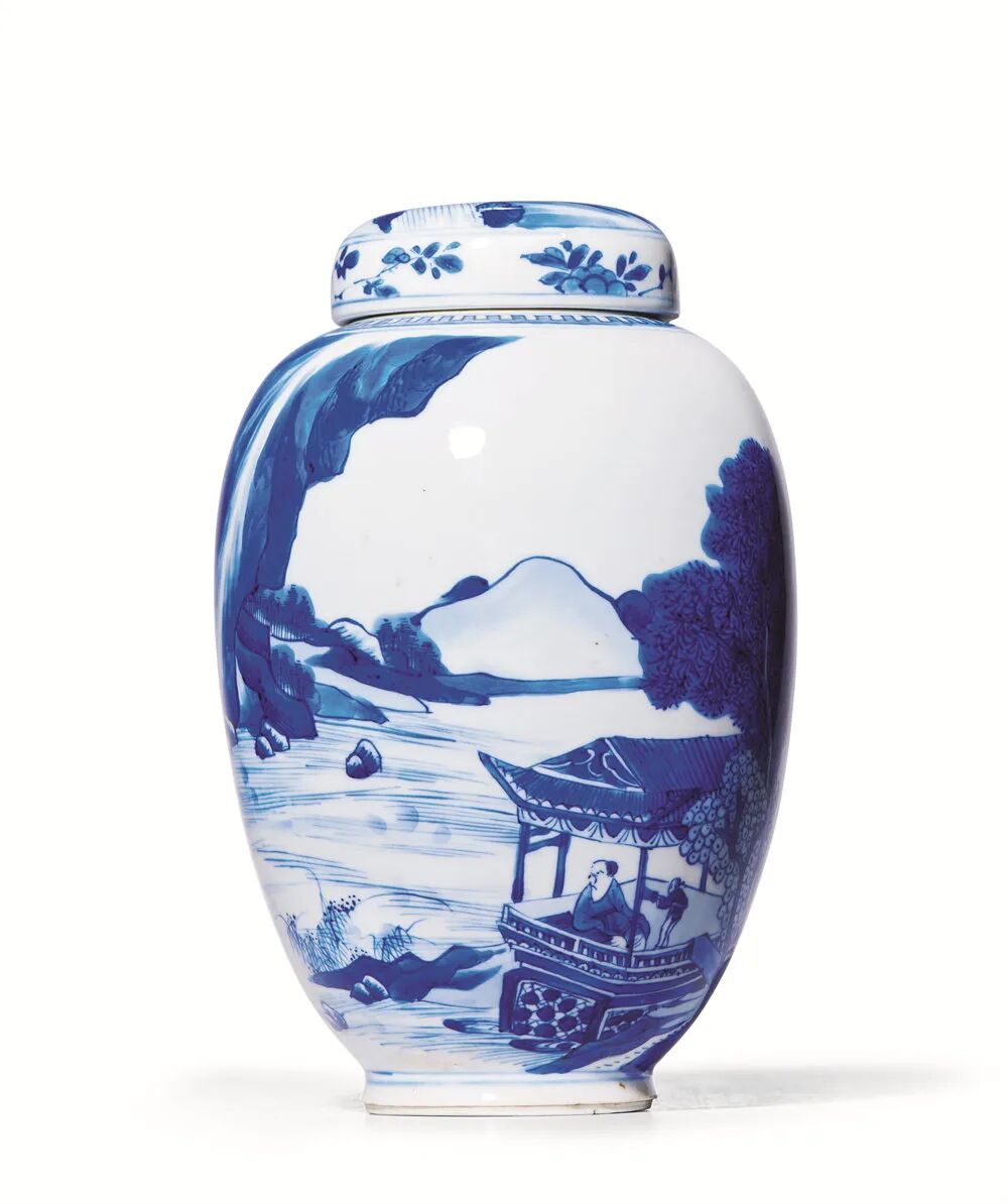 拍品估价:120,000 - 180,000 人民币本品圆口,短颈,丰肩,长腹,圈足,胎釉俱佳。外壁以青花绘通景山水人物纹饰,青花色泽青翠,画意精犷,近似水墨写意风格,深山幽谷,古木参天。高瀑深潭,亭台水榭,高士临渊远眺,童子双手献琴。整体用笔流畅,画面布局层次清晰,舒密得当,以寥寥数笔描绘出细微的人物神态,峻伟的自然景观,画面意境幽雅。拍品仅用一种青花色料,便充分表现出画面的阴阳向背,远近疏密,在白腻胎骨的映衬下,尽显康熙青花之神采,韵味无穷。