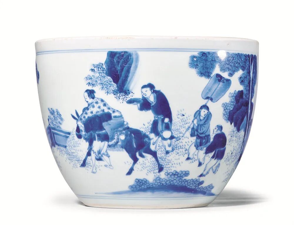 明末清初瓷质文房用品受到文人士大夫的青睐。青翠浓艳的青花发色颇能体现淡泊高远的文人意趣,故而这一时期的青花文房备受文人推崇。此作品外壁青花绘人物故事图,画意直取唐人王驾《社日》诗意,“鹅湖山下稻粮肥,豚栅鸡栖半掩扉,桑柘影斜春社散,家家扶得醉人归”;又有南宋李唐《村社醉归图》:“村南村北赛田祖,夹岸绿杨闻社鼓。醉翁晚跨牸牛归,老妇倚门见引路。信知击壤自尧民,汉世龚黄不如古。披图昨日过水南,县吏科徭日旁午”。人物生动,姿态各异,极富生活气息。山石的表现手法为清代青花绘法发展打下基础,青花色阶丰富,饶富画意。