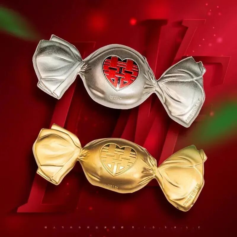 这也是我国首次发行糖果异形的金银条,一金一银,成双成对,有着“果”住甜蜜,让幸福永远相伴的美好寓意!