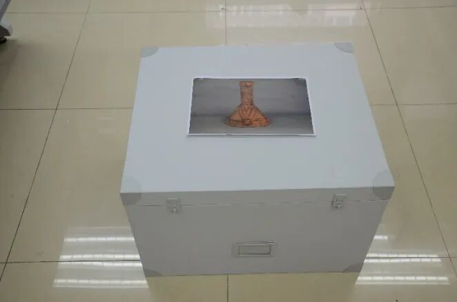 历时将近一年,经过九次脱盐,彩陶鼓的脱盐处理终于完成(图八)。为了避免乙酸等酸性气体再度侵扰,文保人员还为彩陶鼓定制了一个由无酸材料制成的“新家”(图九)。而现在的彩陶鼓,已经重新“上岗”,在国家博物馆“古代中国”基本陈列中,静静地向观众展示着我国神秘悠久的远古文化。![]()
