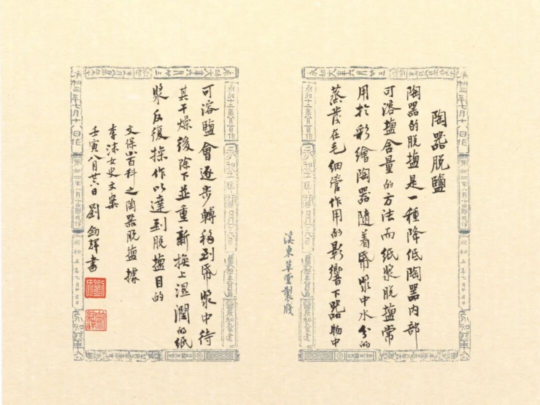 陶器的脱盐是一种降低陶器内部可溶盐含量的方法。而纸浆脱盐,则是一种可以用于彩绘陶器的脱盐方法。随着纸浆中水分的蒸发,在毛细管作用的影响下,器物中的可溶盐会逐步转移到纸张中,待纸浆干燥后除下并重新换上湿润的纸浆,反复操作,以达到脱盐的目的。【相关展览】