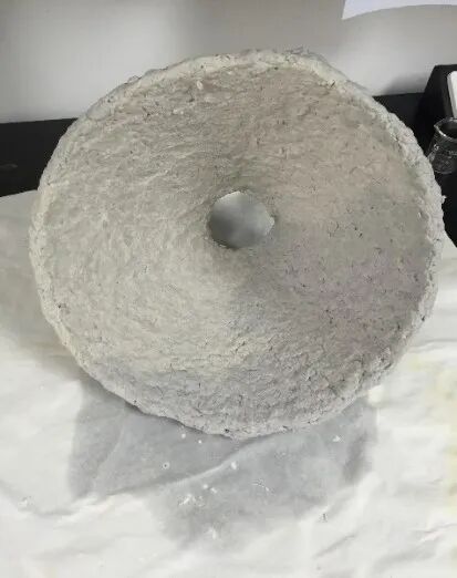 彩陶鼓表面盐结晶现象的处理,可不是简单的把表面清理干净这么简单。因为即便是对表面结晶盐进行全面的清理,环境中的水分仍会携带可溶性污染物,通过毛细作用在陶体孔内发生迁移,使得在环境湿度突变时,病症复发,从而影响彩陶鼓的“健康”。所以,为了将陶体内部的可溶盐离子有效去除,文保人员决定给彩陶鼓做个全身的“深度清洁”。现阶段对于陶器脱盐的处理方法有:蒸馏水浸泡脱盐法、吸附脱盐法和环境控制法。但由于彩陶鼓的彩绘层十分珍贵,且器身中部有断裂修复痕迹,所以最终还是采用了最为传统的纸浆脱盐法,对其进行温和的脱盐处理。将彩陶鼓内外的结晶盐用镊子轻轻夹取,并用软毛刷清理表面后,便可以开始纸浆脱盐的处理了。这个看似神秘的“脱盐”,其实类似爱美的女生“贴面膜”,只不过,给彩陶鼓脱盐的“面膜”没有现成的,需要文保人员动手为之量身打造。具体做法是:把宣纸撕成碎块,放入盛蒸馏水的容器中,加热搅拌使其成为纸浆,在泡好的纸浆中加入适量的1%NaOH水溶液,调节溶液pH至7~8,将此纸浆均匀贴敷一层在彩陶鼓上(图七)。纸浆脱盐法是利用毛细作用,使器物内部的可溶盐类转移到器物表面的纸浆上,并且在敷纸上结晶,这样涂敷一次纸浆,就排出一部分可溶性盐,反复操作若干次后,即可除去可溶性盐。而脱盐过程的终点则由纸浆溶出液中的离子浓度变化最终判定。![]()