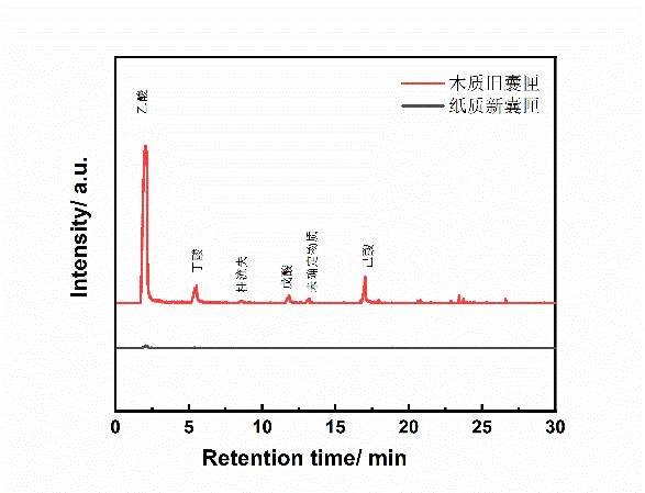 )(图五)。通过深入研究,结晶盐中的乙酸主要为储存陶器所用的木质囊匣挥发的有机物所致(图六),乙酸与原本处于陶器孔隙中的氯离子及陶器中含有的钙离子,在一定温湿度条件下,析出结晶体,最终形成了针状的醋氯钙石。![]()