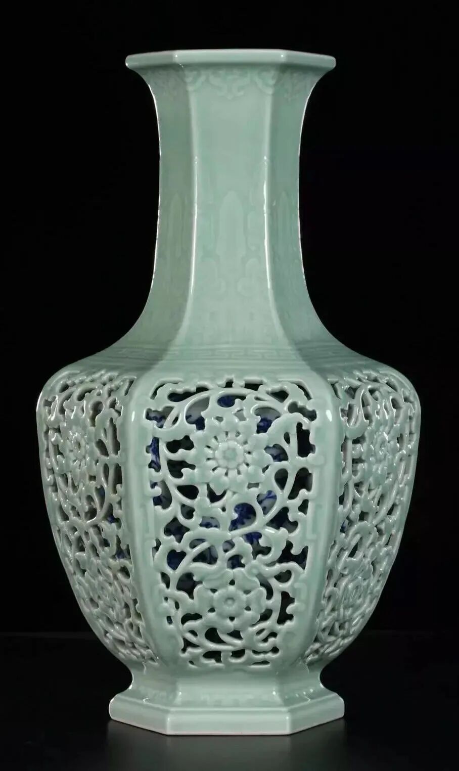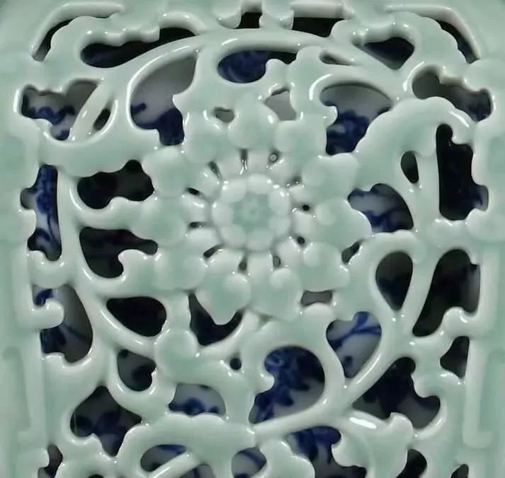 清乾隆 青釉镂空缠枝花卉纹内绘青花六方套瓶