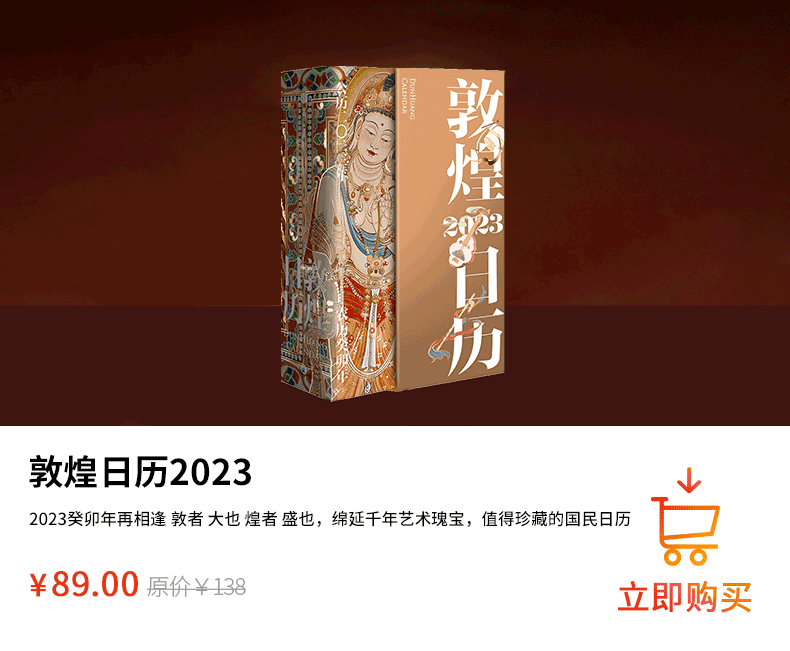 每页配以历史背景、传统文化、绘画技法与审美意趣一一道来,欣赏精美壁画的同时,也了解敦煌与古代传统文化艺术。365日,体味属于中国的古典时尚大赏,浸润敦煌艺术之美,一日一画,历久弥新。365幅壁画,皆是经过专家的推敲打磨,完整壁画与局部画面结合,将数年临摹艺术作品,呈现在日历中。在中式美学中沉淀生活,在每日生活里,浸润敦煌艺术。精装+函套的装帧形式,让整本日历档次提升,文化气息浓重。主色调提取敦煌壁画中富有特点的铅丹色和松石绿,封面用纸还原壁画触感,烫金细节增添雅致,既有特色,又具有丰厚的文化底蕴。可180度平摊翻阅,且硬质封皮,可立于桌上,符合我们日常读日历的需要。左页敦煌壁画,闲时可将目光多留在左页一会儿,观察壁画,品味艺术。右页日期+留白,若事务繁忙,便可直奔右页日期,留白处还可供手写记录。一本日历,将记事贴、敦煌壁画融为一体,功能性十足。简单置于桌上,烫金设计与敦煌壁画元素,又能彰显气质与内涵。每一页的作品,都配有文字解说。解析历史背景、舞乐礼制、人物形象、绘画技法、审美意趣。这是一本日历,更是一本有关敦煌的介绍书籍,敦煌之美,一日看不遍,须得日日沉浸,才能体会个中美妙。每个节日,每个节气,都有精心设计祈福“彩蛋”,巧妙勾连古老珍宝与当下生活。一本敦煌日历,实用性很强,又不失颜值与质感,很适合作为新年礼物赠送亲友。送友人,彰显品位,颜值与实用性兼具。且日历中的祈福元素,也能为友人的生活里,赠去祝福。送子女,扩展知识面,体会敦煌魅力,一本日历放在书桌上,随手记录,随时计划,培养自律好习惯。随书赠送2张国潮版天王如意卡,左天王手托宝珠莲花盘,寓吉祥。右天王手持燃灯,寓希望。2023,见者好运。将敦煌艺术融于一本日历,每天被这样底蕴深厚的画幅浸染,连气质也变得浪漫了许多。敦煌壁画展现着东方艺术与生活的风雅,也记录着东方传统文化与东西方文化的交融。这次所选取的作品,题材涵盖43幅尊像、24例纹样、41款乐器、34种建筑、25个民俗生活场景……