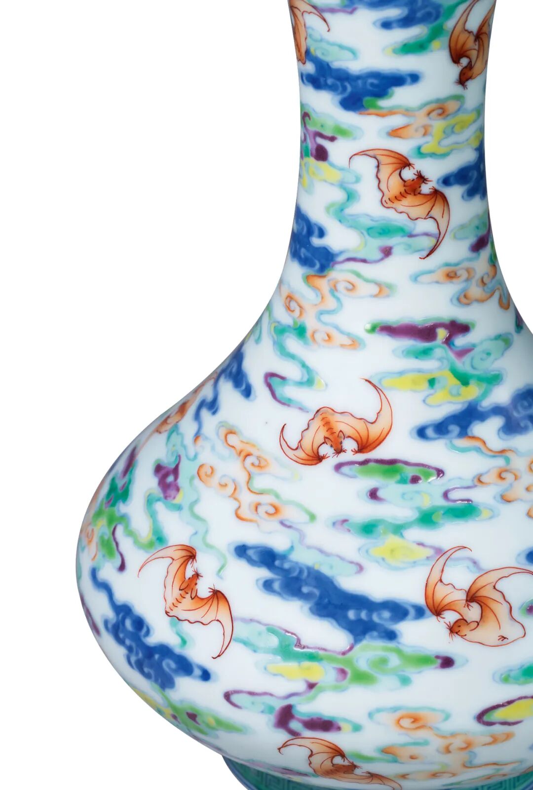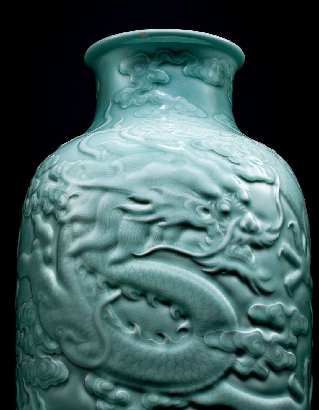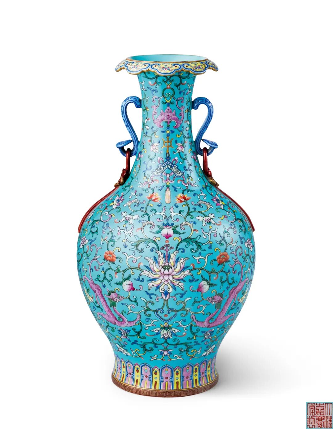 松石绿地洋彩螭龙纹如意耳花口瓶