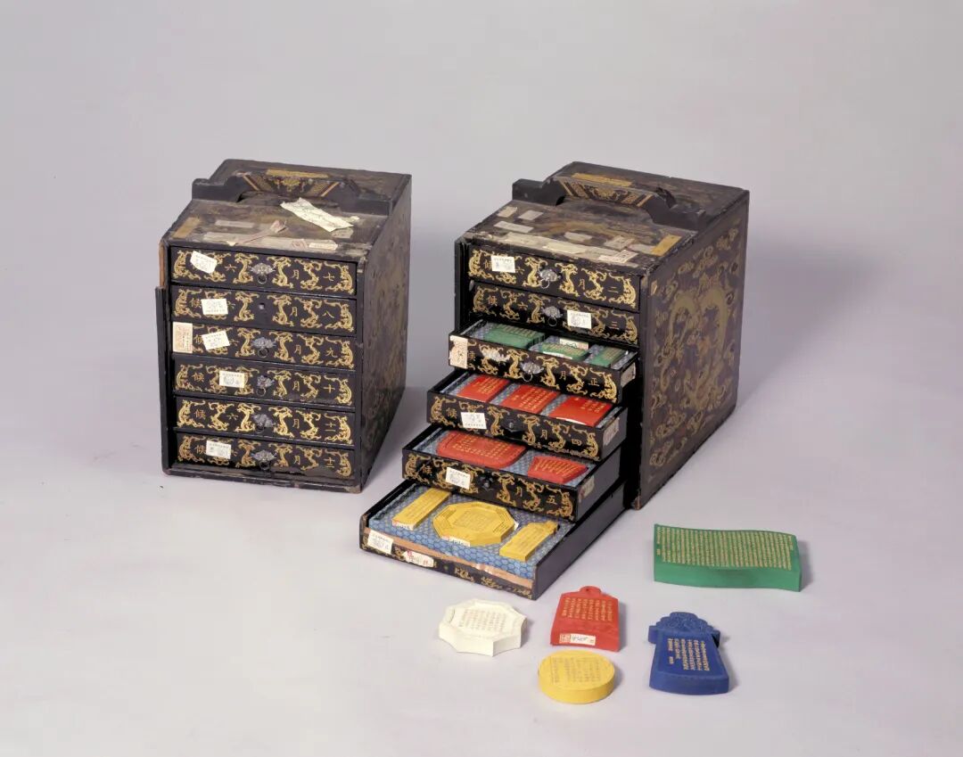 此墨一套两匣,每匣6屉,每屉6锭,共计72锭,一锭墨对应一物候,大小不同、形状各异,有圆形、椭圆形、方形、六角形及叶式、碑式、琴式、钟式等。墨色分绿、红、白、蓝、黄五种,与中国传统五行色彩相对应:春(正月、二月)为木,对应绿色;夏(四月、五月)为火,对应红色;秋(七月、八月)为金,对应白色;冬(十月、十一月)为水,对应蓝色;两季之交(三月、六月、九月、十二月)为土,意为激活、生发,对应黄色。