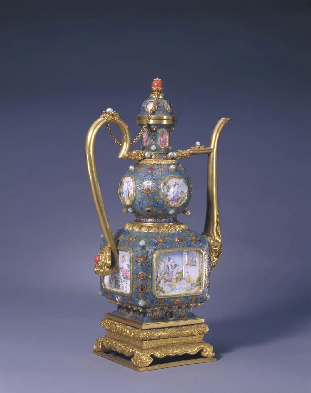 此壶造型沿用明代金执壶样式,制作结合镶嵌、錾刻、掐丝珐琅和画珐琅等多种工艺,胎体厚重,掐丝线条规整,图案精美,装饰高雅华丽。