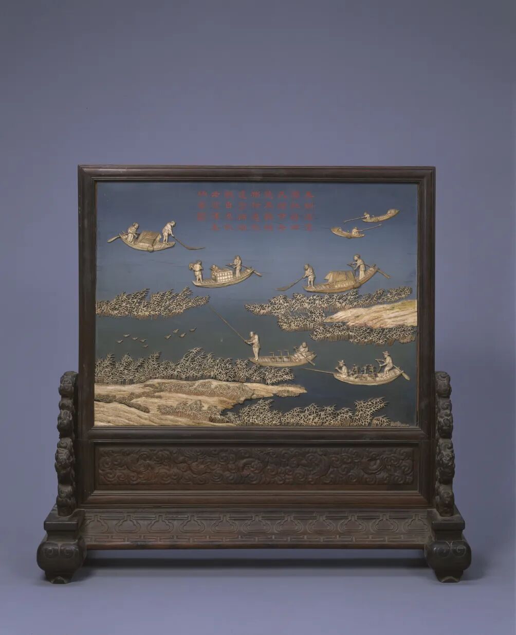 插屏紫檀边座,素面双阳线边框。屏心漆地上牙雕渔人图,一面题为“澄潭集网”,诗云:“集网澄潭图杜诗,四民谋食各听其。鸬鹚独惜遭殴遣,劳捕湖鳞自忍饥。”后钤“乾”“隆”印。绦环板雕鱼水纹。另一面题为“柳浦归渔”;诗云:“归渔艇系绿波涵,牙写犹赢刻楮谙。角韘木盂相对处,增华踵事只生惭。”后钤“古稀天子”印。站牙与立柱一体,雕云蝠纹为饰。须弥座式屏墩。