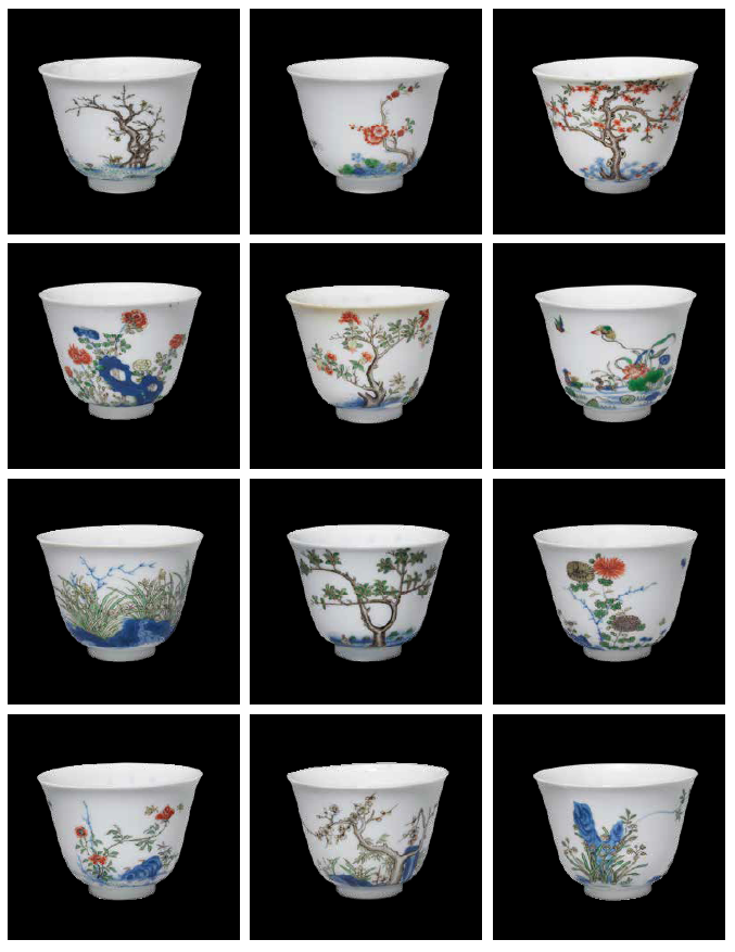 此种成套瓷杯属于御用酒杯,在清宫存世瓷器中数量较大,品质高度一致,修坯规整,胎薄体轻,纹饰规范,款识工整,字体标准,代表了康熙朝景德镇御窑厂制作青花五彩薄胎瓷的最高水平。杯的造型、画面布局、诗句内容、款识字体等,均与康熙青花十二月花卉图题诗句杯一致,两者应出自同一画样,烧造于同一时期。与青花品种相比,青花五彩杯需要两次烧成,制作工艺更复杂,烧成难度更大。