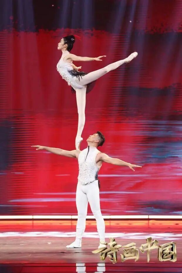 在这段“肩上芭蕾”表演中,女生轻灵飘逸地在男生头顶、肩上踮起足尖,完成“单足尖肩上转体180度”等一系列高难度动作,这些动作既是从鹤的形态中汲取了灵感,也将仙鹤的文化气息注入到时代潮流中。