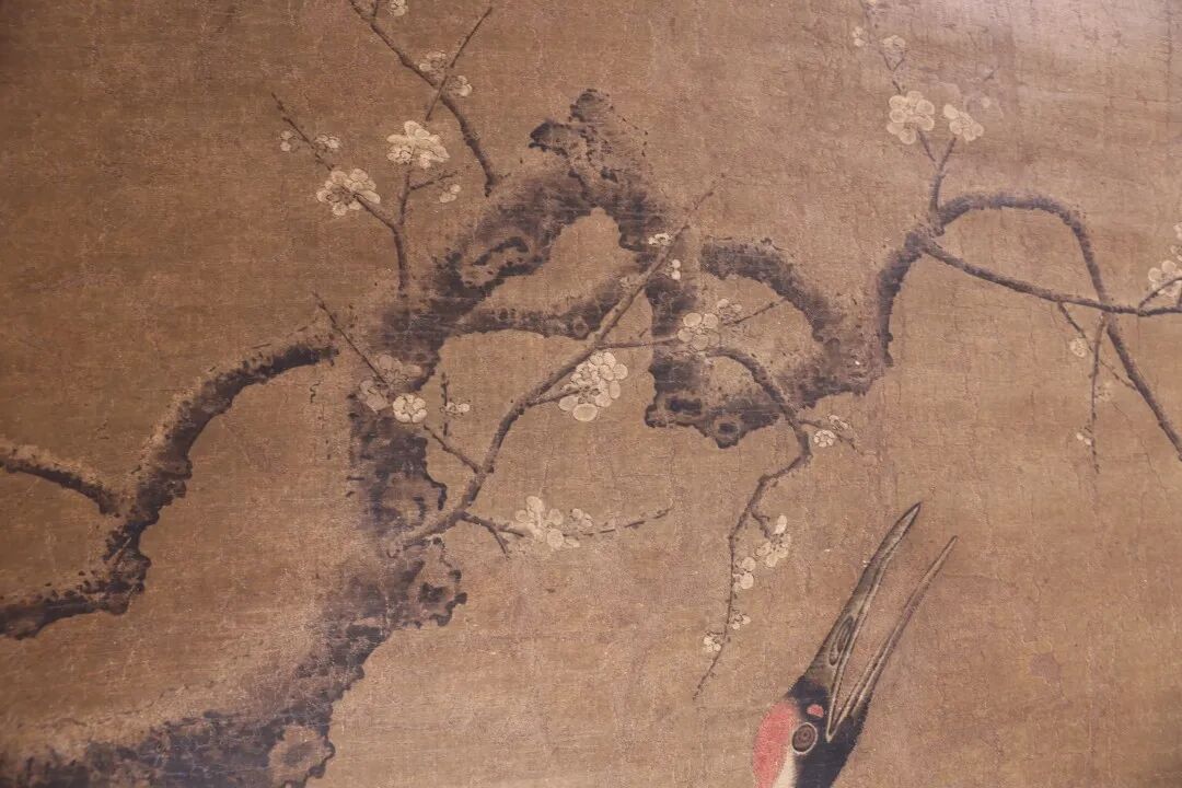 后来他们邀请苏庚春先生到古籍书店鉴定时,苏庚春先生小心翼翼地拭去绢上的污迹,进而用放大镜审视,发现在画的右上角有一炷香题识:“待昭边景昭写雪梅双鹤图”,当即连说“买着了”,很快将作品从古籍书店买回博物馆收藏后送往故宫博物院重新装裱,由此《雪梅双鹤图》焕然一新,成为我们今天所看到的样子。