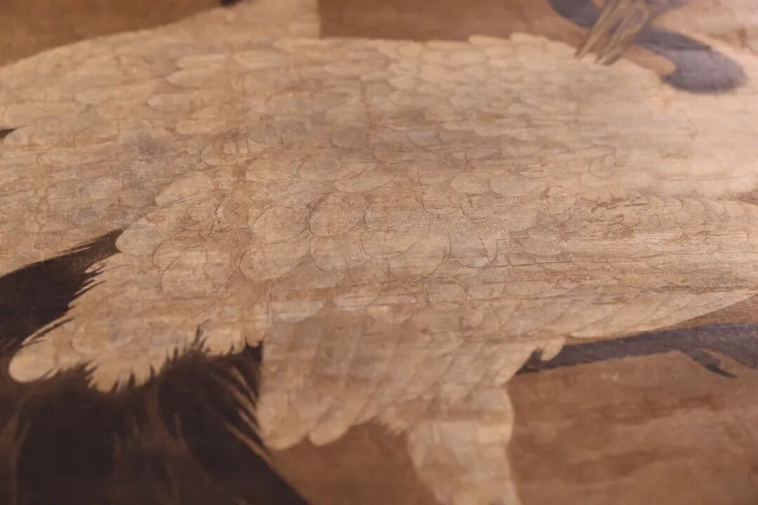 但是《雪梅双鹤图》的画面上,梅花和梅干的表达也是特别精细,鹤的姿态、羽毛的描绘和处理,都十分细腻,是一幅妍丽生动,工致绝伦之作”。