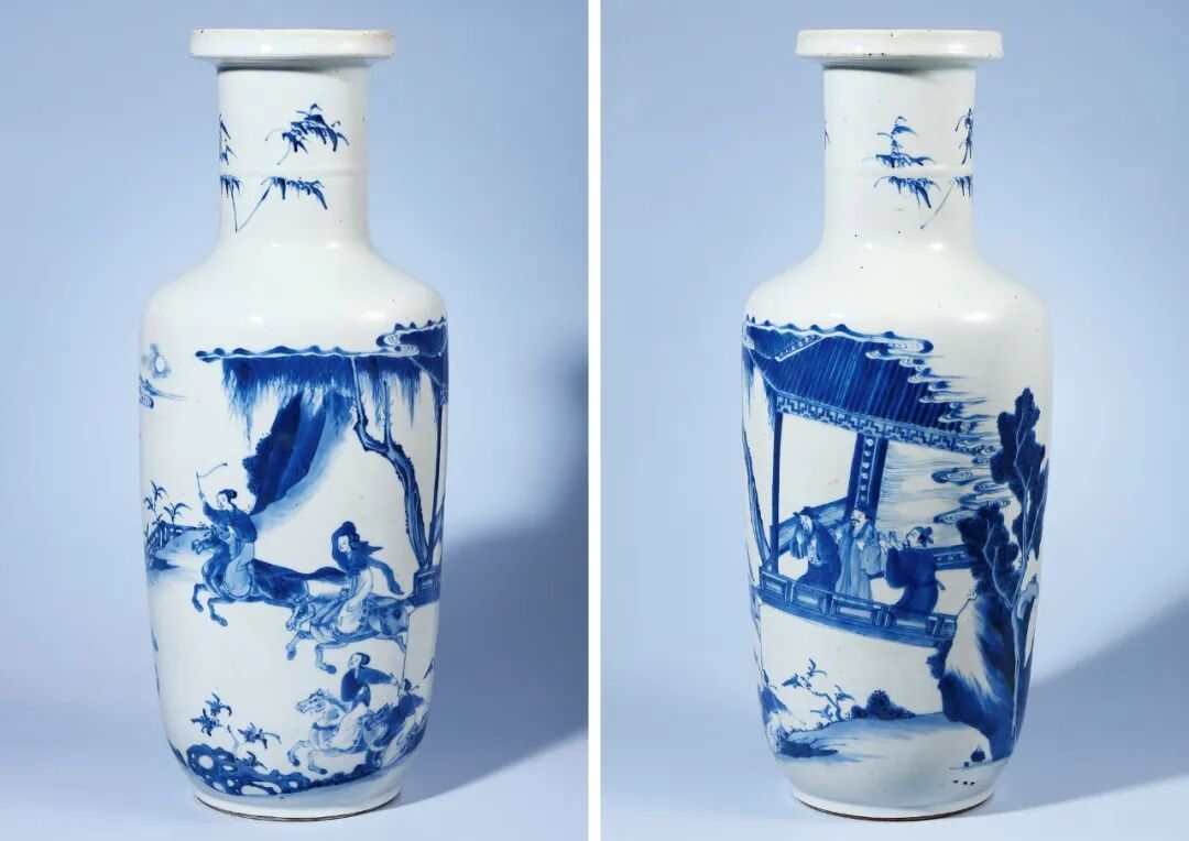 清康熙 青花“隋炀帝夜游西苑观宫人跑马”图棒槌瓶