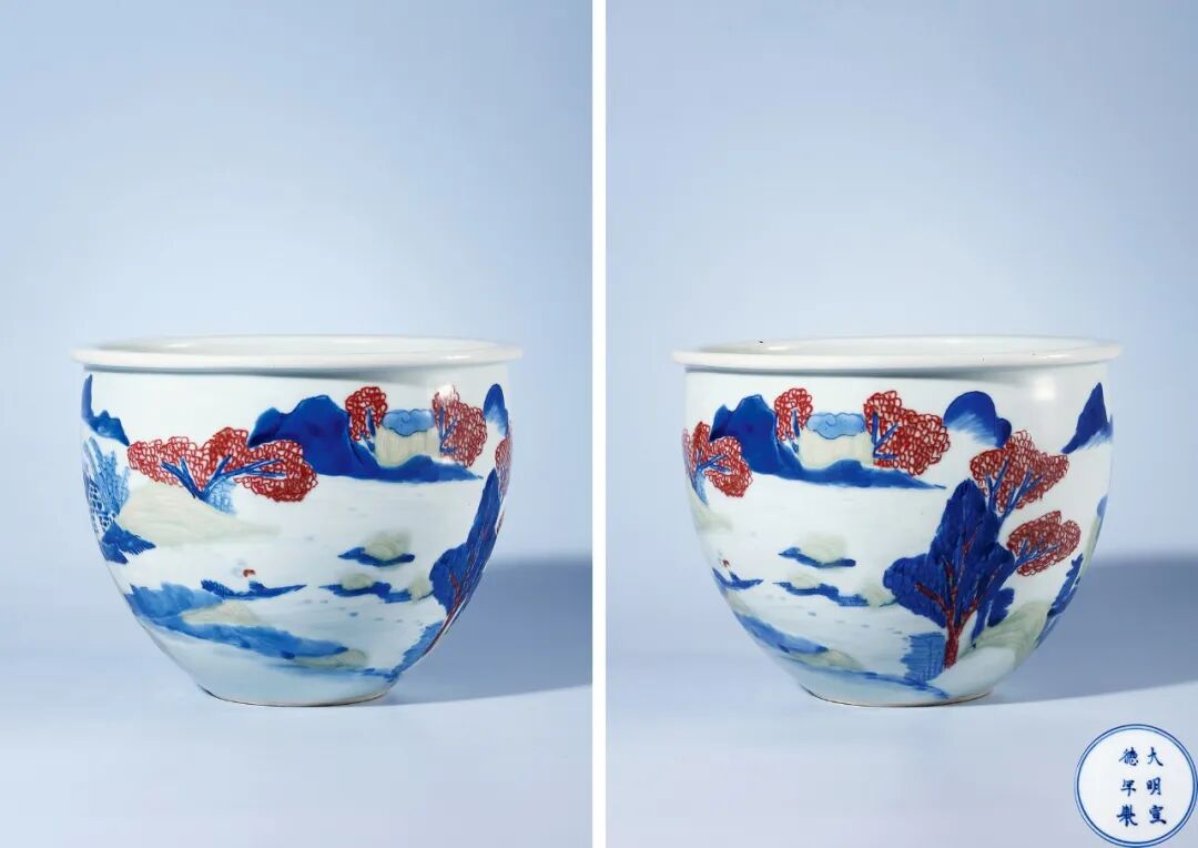 清康熙 釉里三彩通景山水人物景致图案缸