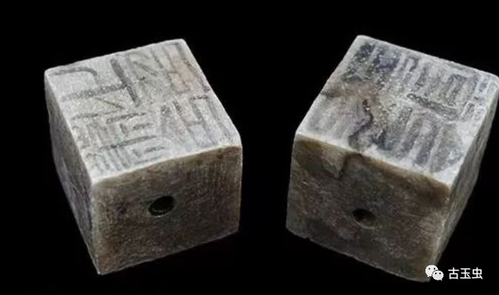 文路两面玉印,秦代。天津博物馆藏。长1.7厘米,宽1厘米,高0.6厘米。