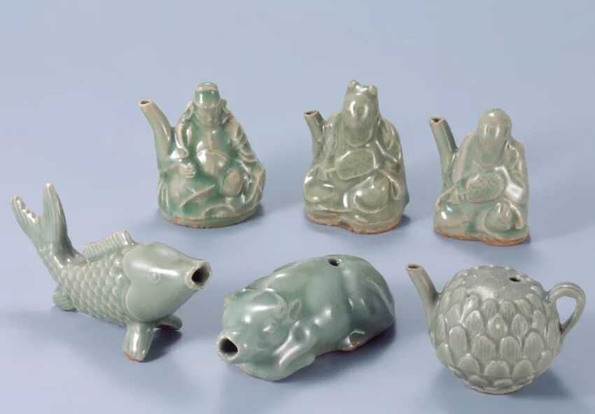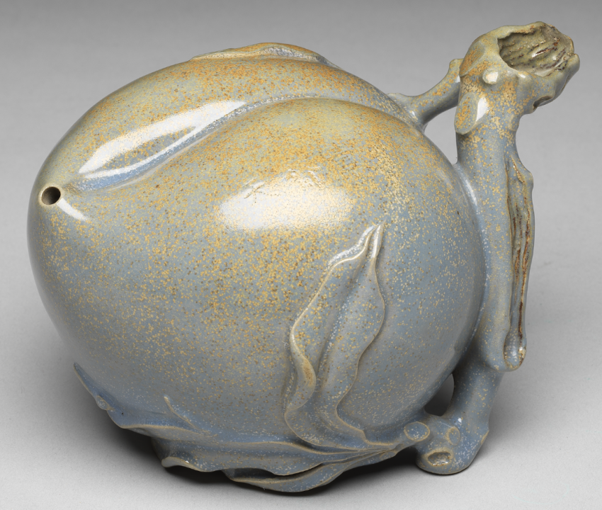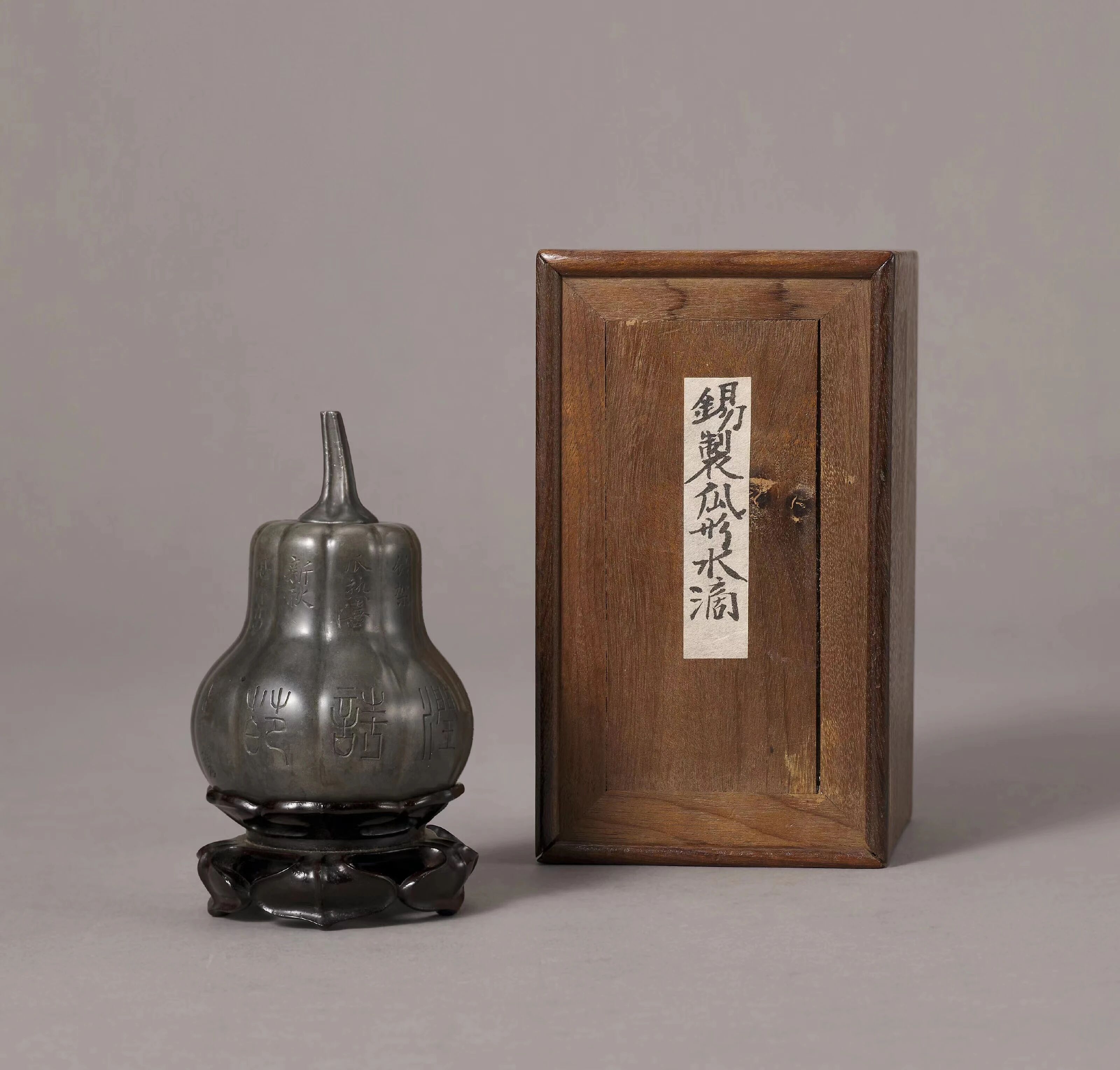 水注是用于贮水点砚的一种用具,一般都有进水孔和注水的流,与砚滴的功用相同,唐宋时期较为流行。其造型有瓜果形、动物形,也有微缩小茶壶的形式。明清时期沿袭制作,有官窑、哥窑制品,还有玉石、玛瑙等制品。
