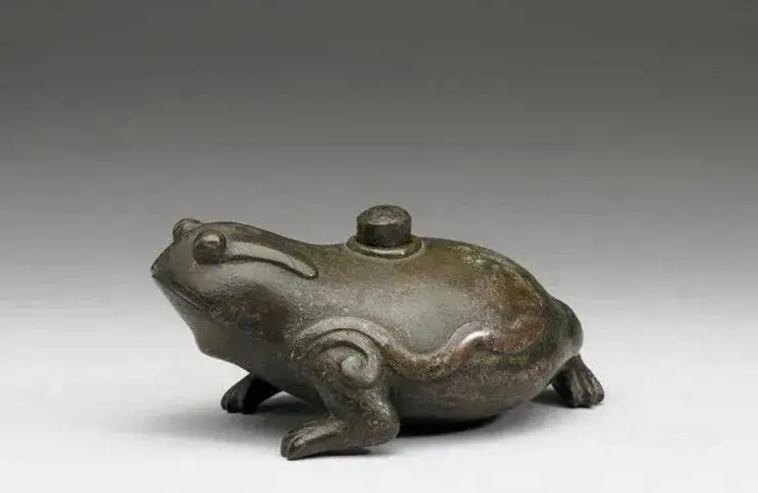 明人文震亨《长物志》卷七也有论述,即“水注之古铜玉者,具有避邪、蟾蜍、天鸡、鹿、半身鸬鹚杓、金雁壶诸式滴子,一合者为佳;有铜铸眠牛,以牧童骑牛作注管者,最俗。大抵铸为人形,即非雅器。又有犀牛、天禄、龟、龙、天马口衔小盂者,皆古人注油点灯,非水滴也。陶者官、哥、白定、方圆立瓜、卧瓜、双桃、莲房、蒂、茄、壶诸式,宣窑有五彩桃注、石榴、双瓜、双鸳诸式,俱不如铜者为雅。”记述了水注的雅俗制作,从中可见明代文人对水注的喜好。