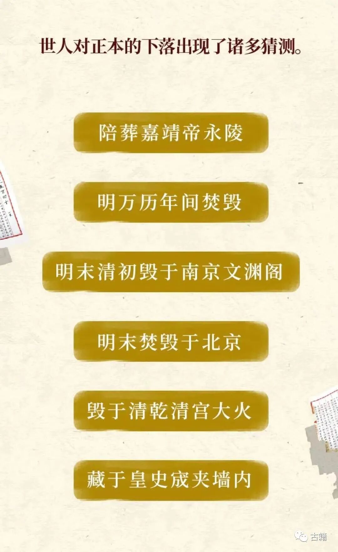 目前流散世界各地的《永乐大典》全都是副本已是共识。换句话说,11095册《永乐大典》正本已经彻底消失了!那么,它是什么时候,又是因为什么原因消失的?